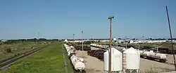 The Grand Trunk Bridge (Saskatoon) or CN Bridge crosses the South Saskatchewan River between the Queen Elizabeth Power Station on the upstream (west) side and Diefenbaker Park on the downstream (east) side. The train bridge commenced construction work in 1906 with rail line service beginning on September 21, 1908.[1] A southwest extension of Circle Drive, which opened in July 2013, passes through C.N. Industrial.[2] Access to businesses in C.N. Industrial is facilitated via an interchange at Lorne Avenue, but the area is now split into two sections with Jasper Avenue no longer crossing Circle Drive.
