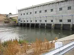 The C.W. Bill Jones Pumping Plant (formerly the Tracy Pumping Plant)[1] located 9 miles (14 km) northwest of Tracy, California, was constructed between 1947 and 1951, and is a key component of the Central Valley Project.[2] The Delta Cross Channel intercepts Sacramento River water as it travels westwards towards Suisun Bay and diverts it south through a series of man-made channels, the Mokelumne River, and other natural sloughs, marshes and distributaries. From there, the water travels to the C.W. Bill Jones Pumping Plant, which raises water into the Delta-Mendota Canal, which in turn travels 117 miles (188 km) southwards to Mendota Pool on the San Joaquin River, supplying water to other CVP reservoirs about midway. The Tracy Fish Collection Facility exists at the entrance of the pump plant in order to catch fish that would otherwise end up in the Delta-Mendota Canal.[3]