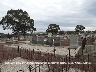 Charles pre-deceased his younger brother by three years, dying in 1945, aged 83. He is buried in the family grave in the Maddingley Central Cemetery, in Bacchus Marsh, Victoria. The cemetery has been in use since the 1860s. The Brittlebank grave also holds four other relatives of Charles, as follows: