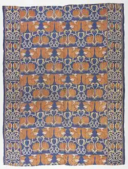 At the suggestion of his friend A. H. Mackmurdo, Voysey began designing wallpapers in 1883 under contract for Jeffrey & Co[3] while waiting for architectural commissions to come in.[4] He joined the Art-Workers' Guild in 1884, and displayed both printed textiles and wallpapers at the inaugural Arts and Crafts Exhibition Society show at the New Gallery in 1888.[5] In 1893 he began designing wallpapers for Essex & Co., for whom he executed several hundred patterns.[3]