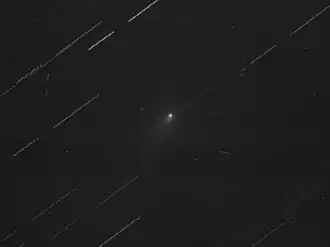 It made its closest approach with Earth on 21 October 1957, when it came within 0.1257 AU (18.80 million km) from our planet.[4] Based on Candy's calculations, the comet should have reached perihelion by 5 December 1957, provided it had not disintegrated beforehand.[1]