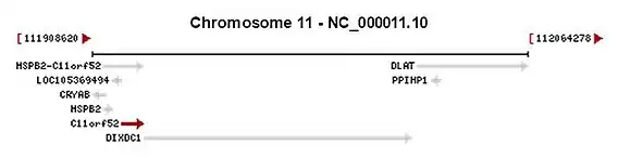 C11orf52 is located on chromosome 11 at 11q23.1, starting at 111908620 and ending at 112064278.[5] C11orf52 spans 155658 base pairs and is orientated on the positive strand. Gene C11orf52 has a molecular weight of 14kDa and is a protein coding gene of 7,995 bp containing four exons. The coding region is made up of 1,168 bp.[6]