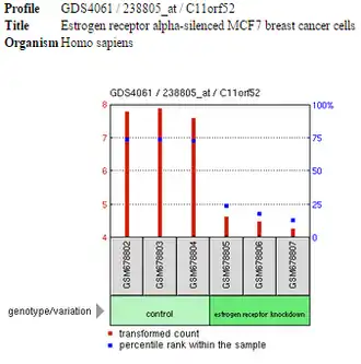 C11orf52 is highly expressed in the thyroid, thalamus, pituitary, placenta, and prostate, kidney, heart, and skeletal muscles.[7] However, in estrogen receptor alpha-silenced MCF-7 breast cancer cells, it is expressed at an extremely low level compared to control tissues.[8]