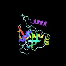 The structure of the protein encoded by c15orf61 consists of alpha helices and beta strands. A predicted tertiary structure of the protein encoded by c15orf61 is shown to the right.