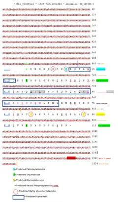 ALAESM does have a few predicted reactive sites. It is predicted to be palmitoylated at position 10, allowing the covalent attachment of fatty acids.[15] It is predicted to undergo glycation at positions 21 and 101 which attaches a sugar molecule to the amino acid.[16] It is predicted to have a nuclear export signal strand from position 55-64 which signals the protein to leave the nucleus.[17] It likely can be glycosylated at position 82 and 94 which attaches a carbohydrate to the amino acid.[18] It is predicted to be phosphorylated by an unspecified actor at position 10, 82, and 94 in the nucleus.[19]