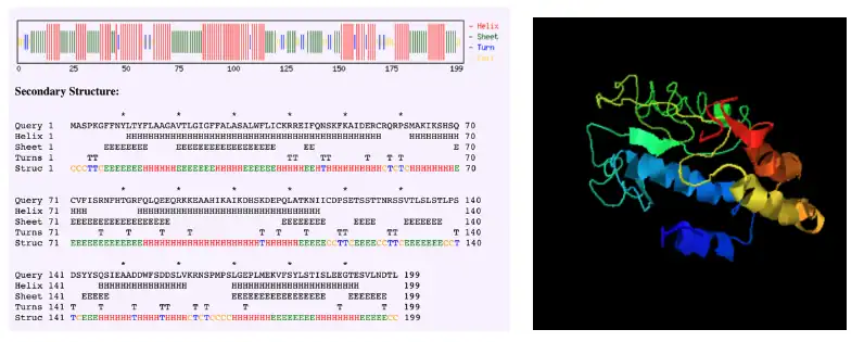 Below are predicted secondary and tertiary structures of C1orf185, modeled using the Chou-Fasman[15] secondary structure prediction tool and the I-TASSER[16] protein structure and function prediction tool. Chou-Fasman predicts a mixture of α-helices, β-sheets, and other structural turns and coils, which can be seen modeled on the I-TASSER prediction.