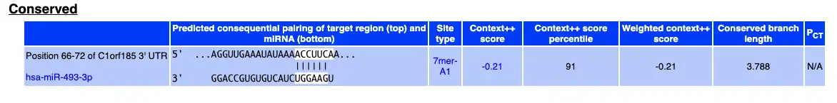 C1orf185 has one conserved miRNA binding site of type 7mer-A1 among several orthologs.[21] The presence of a 7mer-A1 binding site indicates that C1orf185 is likely to be post-transcriptionally repressed.[22]
