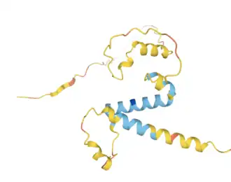 The secondary structure is predicted to consist mostly of alpha helices.[16] The predicted 3D structure via Alphafold is shown.[19] Various alpha helices and a disordered region can be seen.