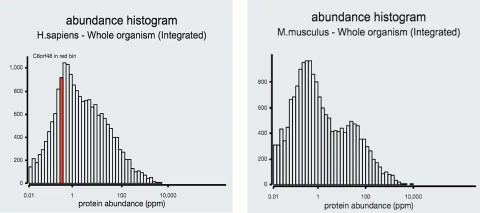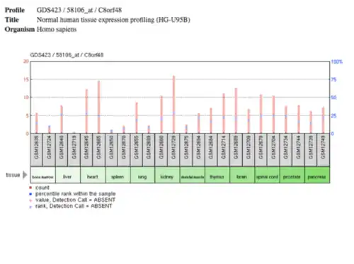 This gene has been found to be overly expressed in the tissues of the testis and colon muscle, as well as expressed in 76 developmental stages.[23] C8orf48 has been found to be expressed most often in the bladder, bone, heart, larynx, testis, and thyroid.[24] In regards to the developmental stages, C8orf48 was most often found in the embroid body.[24]