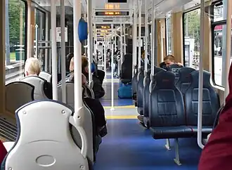 The Edinburgh trams are bi-directional, 42.8 metres (140 ft 5 in) long[1][6] and built with 100% low-floor access to meet UK Rail Vehicle Access Regulations for disabled people. Passenger capacity is 250 – 78 seated, 170 standing and 2 wheelchair spaces[1] – and the trams will be fitted with CCTV.[7][5]