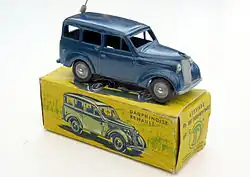 The exclusive production of model cars for Citroën ended in 1934 when Citroën went into administration and was eventually taken over by Michelin.[3] Many years later, CIJ signed a less binding contract with Louis Renault concerning numerous types of Renault model cars in scales ranging from 1:10 to 1:43, partly made of lithographed metal, or in particular, zamak. This time, CIJ was solely responsible for distribution. An agreement with Shell for miniatures of filling stations, including the transporter Shell Berre was signed in 1950. This model car was made of an alloy called ramec (which blended aluminium, copper, zinc and magnesium).[4] On 27 December 1964, new facilities were inaugurated in Briare. But one year later, after the company had bought the stash of its former competitor JRD,[5] the company CIJ effectively disappeared. The Bapterosses family kept on producing exclusive series' of artisan type models in the Rivotte farm (in the vicinity of the factory) but the Briare works were absorbed by ITT and produced henceforth parts for telephones.[4]