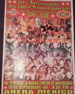 The CMLL 70th Anniversary Show (Spanish: 70. Aniversario de CMLL) was a professional wrestling major show event produced by Consejo Mundial de Lucha Libre (CMLL) that took place on September 19, 2003, in Arena Mexico, Mexico City, Mexico. The event commemorated the 70th anniversary of CMLL, the oldest professional wrestling promotion. in the world. The anniversary show is CMLL's biggest show of the year, their Super Bowl event. The CMLL Anniversary Show series is the longest-running annual professional wrestling show, starting in 1934.