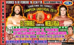 The CMLL Universal Championship is an annual tournament exclusively for wrestlers who hold a CMLL-recognized championship at the time of the tournament. The tournament was first held in 2009, but not held in 2018 for unexplained reasons, making the 2019 version the tenth overall tournament. Being a professional wrestling tournament, it is not won legitimately; it is instead won via predetermined outcomes to the matches that is kept secret from the general public. In the finals of the 2019 tournament Mexican National Heavyweight Champion El Terrible defeated the CMLL World Light Heavyweight Champion Niebla Roja to become a two-time tournament winner.