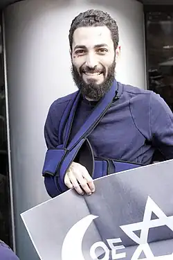 Combo was "savagely beaten" by "four youths" on 30 January 2015 and suffered a dislocated shoulder after he painted a wall at Porte Dorée near Paris with the word "coexist" written with letters created from religious symbols.[3]