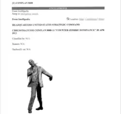 CONPLAN 8888, also known as Counter-Zombie Dominance, is a U.S. Department of Defense Strategic Command CONOP document that describes a plan for the United States and its military to defend against zombies in a fictional military training scenario.[1][2][3][4][5][6] It was initially classified by the United States Intelligence Community, but was eventually declassified following a Freedom of Information Act request.[2]