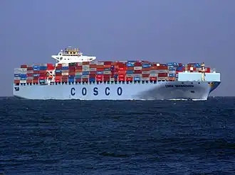 COSCO Guangzhou is a container ship built for Cosco Ship Management in 2006. The ship has capacity for 9,500 TEU and mostly sails between the ports in China, India and Japan and those in Western Europe and the United States.