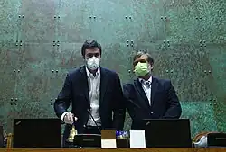 The President and Vice President of the Chamber of Deputies of Chile using protective masks. - 16 March: 81 new cases are confirmed in a single day, increasing the total to 156 confirmed cases. According to the definition of the Health Organization (WHO), the start of stage 4 of the pandemic begins, as President Piñera announces the closure of "all land, sea and air borders (...) for the transit of foreign people". Chilean nationals and permanent residents were allowed to enter after a mandatory 14-day quarantine.[46]