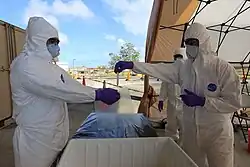 ![]() Guam National Guardsmen dropping a COVID-19 test into a bag for transport to a testing lab, April 22 | |