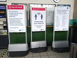 The Waterloo & City line, several tube stations and the Night Tube were suspended on 19 March,[36] with the Mayor of London and Transport for London (TfL) urging people to only use public transport if absolutely essential so that it can be used by critical workers.[37] From 20 March, 40 tube stations were closed.[36] From 25 March, London Underground measures to combat the spread of the virus by slowing the flow of passengers onto platforms included the imposition of queuing at ticket gates and turning off some escalators.[38]