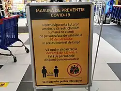 Until 17 March, the Ministry of Foreign Affairs facilitated the return to the country for 137 Romanians who were abroad, either as tourists, in transit, or in medical emergency situations and who were directly affected by the measures adopted by the states in which they were.[51] Later that same day, the government issued its first Military Ordinance, in response to the ongoing health crisis.[52] Four days later, on 21 March, a second Military Ordinance was issued: no groups larger than 3 people on the streets. Curfew from 10 p.m. to 6 a.m. All shopping centres were closed, except for the sale of food, veterinary or pharmaceutical products and cleaning services. It was forbidden for foreign citizens and stateless persons to enter Romanian territory, except through the specially organised transit corridor, further exceptions being made for other categories, such as residents, family members, and others.[53][54]
