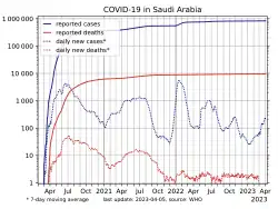 ![]() Graph showing COVID-19 cases and deaths in Saudi Arabia from April 2020 to April 2023 | |