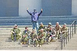 The reopen protests were generally small, with protester numbers ranging from a few dozen to the low hundreds; the first protest in Michigan drew twenty thousand protestors, as estimated by the state police.[21] Protesters included mainstream Republicans,[22] but also far-right groups including Proud Boys and armed militia movement supporters.[4] A large number of "anti-vax" advocates have attended, and some have been the organizers of local protests.[23][24] Ben, Chris and Aaron Dorr, three guns-rights activist brothers, are the organizers of protests in several Midwestern states.[25][26]