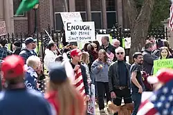 On May 4, hundreds gathered outside the Massachusetts State House for a Liberty Rally promoted by conservative radio show host Jeffrey Kuhner and by Super Happy Fun America, the organizers of the controversial 2019 Boston Straight Pride Parade.[82] The rally crowd was "tightly packed", largely ignored social distancing protocols, and many in the group refused to wear masks.[83][84]