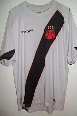 Vasco currently has three kits. The home shirt's main color is black with a white sash. The short and the socks are black. The away kit is similar to the home kit, but the main color is white, the sash is black, and the shorts and socks are white. In 2009–10 the third kit was all white, with a red "cross of the Knights Templar". In 2010, the away kit changed to black in honor of 1923's team, which was willing to give up playing in the following year due to other clubs' opposition to Vasco having black players.