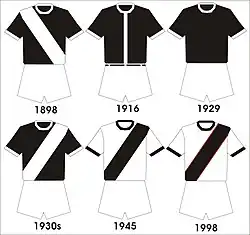 Vasco's first football kit, created in 1916, was completely black, and was easily identified because of the presence of a white tie and a belt. In 1929, the tie and the belt were removed. However, the kit remained all-black. In the 1930s, the home kit's color was changed again; it became black with a white right diagonal sash.[50]