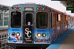 The CTA Holiday Train is a Chicago "L" train which traditionally runs during the winter holidays, from November to December.[1] Six cars are traditional passenger cars adorned with seasonal decorations and bright lights. The interior of these cars are adorned with multi-color lights, red bows, garland, and red and green overhead lighting. The hand poles are transformed into inedible candy canes. Santa Claus rides on an open-air flatcar and waves to the passengers coming aboard from his sleigh.