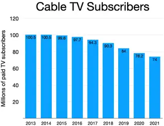 A 2021 Pew Research Center survey found that the percentage of American adults that reported having a cable or satellite television subscription fell from 76% in 2015 to 56% in 2021,[7] while a 2025 Pew Research Center survey found that only 36% of American adults reported having a cable or satellite television subscription.[8]