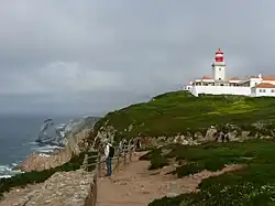 The Cabo da Roca Lighthouse (Portuguese: Farol do Cabo da Roca) is a beacon/lighthouse located 165 metres (541 ft) above the Atlantic Ocean, on Portugal's (and continental Europe's) most westerly extent.[2] It is located in the civil parish of Colares, in the municipality of Sintra, situated on a promontory made up of granite boulders and interspersed limestone. It is a third-order lighthouse, which originally began operating in 1772. It was the first new purpose-built lighthouse to be constructed in the country; the older lighthouses in existence at that time were constructed on existing platforms or from pre-existing beacons.[3]
