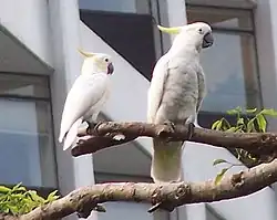 An introduced population of these birds is found in Hong Kong. Hong Kong’s feral population is estimated to be around 200, 10% of the total wild population.[19] They are a common sight across the densely populated area on both sides of the harbour, easily spotted in the woods and public parks in the north and west of Hong Kong Island. The large group has developed from some caged birds that have been released into the Hong Kong area over many years.[20] An often repeated story is that Hong Kong Governor Sir Mark Aitchison Young released the Government House's entire bird collection – including a large number of yellow-crested cockatoos – hours before surrendering Hong Kong to Japanese troops in December 1941.[21] Historians and conservation biologists in Hong Kong have found no evidence to corroborate this story, and believe that Hong Kong's yellow-crested cockatoo population is made up of escaped pets. The earliest record of an escaped yellow-crested cockatoo pet comes from 1959.[22]