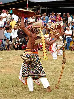 According to local folklore, caci during festivals began with two brothers who owned a buffalo. When the younger brother fell into a deep hole, the older brother had to slaughter the buffalo to get its skin to help his sibling escape from the hole.[3] The community celebrated this act of love with a festival in which caci matches were held.