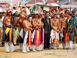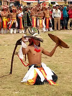 Competitors are bare-chested and wear pants covered by an embroidered woven sarung songke (songket sarong). Their lower backs and ankles are adorned with small jingling bells, which make peculiar sounds when moving and fighting. The upper body is intentionally uncovered in order to be exposed to the whips' lashes.[2] The masked helmets are made of buffalo hide that is wrapped in colourful cloths with horn-like headgear, along with head-cloths worn over the face.[3]