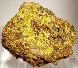 Cacoxenite is an iron aluminium phosphate mineral[5] with formula: Fe3+24Al(PO4)17O6(OH)12·17(H2O).[4] Cacoxenite is associated with iron ores.[6] The name comes from the Greek κăκός for "bad" or "evil" and ξένος for "guest" because the phosphorus content of cacoxenite lessens the quality of iron smelted from ore containing it.[5][7]