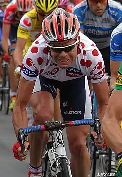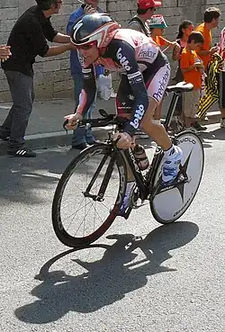 Evans finished second on stage one of the Tour de France, and won stage 4, the third Tour de France stage win of his career.[23] Evans then led the mountains classification after stage 4 for a single day. As the Tour de France continued Evans was looked upon often to chase down breakaways in order to preserve his position in the top 5 of the general classification and in order to maintain time gaps that he believed he could strategically make up in the individual time trial of stage 20.[24] During stage 19, Evans was forced to chase an early breakaway containing the general classification contenders and led by Alberto Contador, who at the time was seeking his 4th Tour de France win. However, he experienced mechanical trouble and was forced to change bikes. He again led the peloton to pull back the contender group, keeping himself within striking distance for overall victory by remaining just under a minute behind Andy Schleck. On the time trial, the last stage before Paris, Evans took the lead of the general classification by 1' 34" after finishing close second in the stage, beating previous race leader Schleck by 2' 31".[25] With the win he became the first Australian to win the Tour de France, the second non-European to have officially won it, and the oldest to win the overall general classification in the post-war era.[26]