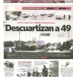 The Cadereyta Jiménez massacre occurred on the Fed 40 on 12–13 May 2012.[1] Mexican officials stated that 49 people were decapitated and mutilated by members of Los Zetas drug cartel and dumped by a roadside near the city of Cadereyta Jiménez in northern Mexico.[2][3] The Blog del Narco, a blog that documents events and people of the Mexican Drug War anonymously, reported that the actual (unofficial) death toll may be more than 68 people.[4] The bodies were found in the town of San Juan in the municipality of Cadereyta Jiménez, Nuevo León at about 4 a.m. on a non-toll highway leading to Reynosa, Tamaulipas.[5][6] The forty-three men and six women killed had their heads, feet, and hands cut off, making their identification difficult.[2] Those killed also bore signs of torture and were stuffed in plastic bags.[7] The arrested suspects have indicated that the victims were Gulf Cartel members,[8] but the Mexican authorities have not ruled out the possibility that they were U.S.-bound migrants.[9] Four days before this incident, 18 people were found decapitated and dismembered near Mexico's second largest city, Guadalajara.[10]