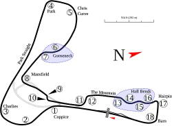 Cadwell Park is a motor racing circuit in Lincolnshire, England, 5 mi (8.0 km) south of Louth, owned and operated by MotorSport Vision, a business associated with former racing driver Jonathan Palmer.[1] Sited on former parkland across a steep-sided valley with dips and crests, the circuit features sharp changes in gradient, including one section called The Mountain where bikes can become airborne by up to several feet. Its mix of challenging corners has led to its nickname as the Mini-Nürburgring.[2][3]