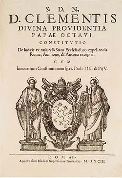 Caeca et Obdurata Hebraeorum perfidia (named for its Latin incipit, meaning the blind and obdurate perfidy of the Hebrews[1]) was a papal bull, promulgated by Pope Clement VIII on 25 February 1593, which expelled the Jews from the Papal States, effectively revoking the bull Christiana pietas (1586) of his predecessor Pope Sixtus V.[2] Prior to 1586, Pope Pius V's bull Hebraeorum gens sola (1569) had restricted Jews in the Papal States to Rome and Ancona.[2]