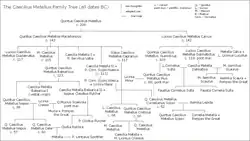 The nomen Caecilius is omitted for all the men named Metellus. All dates are BC, except stated otherwise. Numbers in brackets indicates the order of marriages. Dotted lines show adoptions.