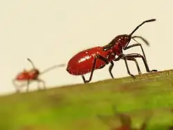Caenocoris nerii can reach a length of about 7.5–9.5 millimetres (0.30–0.37 in).[5] The female is larger than the male. Bodies are elongated. The basic color of the body is black, with red markings. Two red quadrangular patches are present on the head. Two red markings appear on the shoulders of pronotum and at the inner margins of the hemielytra, which only partially cover the membranous blackish wings. Scutellum and abdomen are completely red.[6][7]