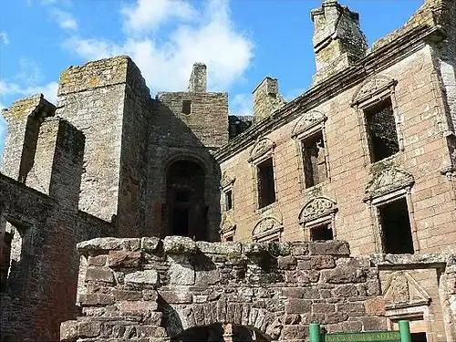 Within the courtyard formed by the curtain walls there are four ranges: the Gatehouse, the west range, the Banqueting Hall range and the Nithsdale Lodging range (see plan), a small triangular courtyard being formed between them. [20] These ranges are of different dates. Especially to the south, the buildings are ruinous, the Banqueting Hall range in particular being reduced for the most part to no more than a few metres high.