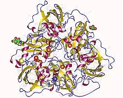 - ^ Takahashi N, Ortel TL, Putnam FW (Jan 1984). "Single-chain structure of human ceruloplasmin: the complete amino acid sequence of the whole molecule". Proceedings of the National Academy of Sciences of the United States of America. 81 (2): 390–4. Bibcode:1984PNAS...81..390T. doi:10.1073/pnas.81.2.390. PMC 344682. PMID 6582496.