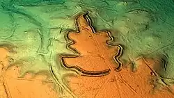 The layout consists of a number of steep banks and ditches in the shape of an oak leaf, enclosing a large flat area of a settlement. The main entrance is at its northern end (at the tip of the leaf) and is very well defended with multiple banks and a sinuous entrance road. The banks to the side of the entrance are very steep, guiding any entrants along the way.[3] It is north of the Roman road known as the Devil's Highway which connected Londinium to Calleva Atrebatum (Silchester). It is within the Crowthorne Woods part of Swinley Forest crown plantation and is located off Nine Mile Ride approximately 0.75 miles (1.2 km) from the Look Out visitor centre. Much of the fort is covered by mature broadleaf and coniferous trees, although some of the spruce plantation on the southern part of the fort has been cleared, and the ground reverted to heathland and scrub. On clear days, central Bracknell and Crowthorne, including Broadmoor hospital, are visible from its highest points. The camp falls within the Broadmoor to Bagshot Woods and Heaths Site of Special Scientific Interest, and forms part of the northern edge of the SSI. The zone protects numerous rare birds such as the woodlark and nightjar, as well as its diverse insect life and fauna.