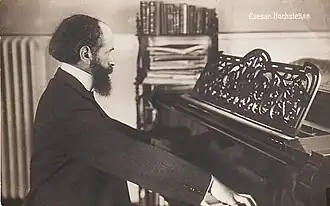 Caesar Hochstetter published his arrangement “Album fuer einhändige Klavierspiel: 8 Stuecke von Bach, Chopin, Schumann, Reger und Zichy”, for right or left hand (Breitkopf & Haertel, 1915).[4] His known works also include “Zwei Clavierstücke” Op. 2 (R. Forberg, Leipzig), arrangements for Bach's “Sarabande und Bourrée” for piano (A. Holzmann, Zurich) and “10 kleine Stücke Op. 24” (A. Holzmann, Zurich).
