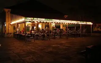 Café du Monde (French for 'Café of the World' or 'the People's Café') is a renowned open-air coffee shop located on Decatur Street in the French Quarter of New Orleans, Louisiana, United States. It is a New Orleans landmark and tourist destination, known for its café au lait and beignets. Its coffee with chicory is widely available in the continental United States.