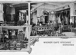 The Café Stefanie was a coffeehouse in Munich which around the 1900s till the 1920s was the leading artists' meeting place in the city, similar to the Café Größenwahn atmosphere of the Café des Westens in Berlin and the Café Griensteidl in Vienna.[1][2][3][4] The cafe was located on the corner of Amalienstraße and Theresienstraße in the Maxvorstadt not far from the Simplicissimus cabaret and Die Elf Scharfrichter. At the time it was one of the few establishments in Munich which stayed open till 3:00 in the morning.