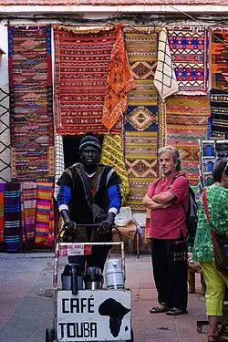 The coffee-to-djar ratio is typically around 80 percent coffee to 20 percent djar. In recent years, consumption of café Touba has been increasing as the drink is spreading to cities of all faiths, both in and outside Senegal.[4] The World Bank wrote that a progressive elimination of imported coffee seems common in poorer areas of Senegal as a result of the global recession of 2009: a Senegalese restaurant owner stated, "We weren't used to consume [sic] the Tuba Coffee for breakfast, but since the crisis people drink it a lot, also children."[5] Commercial export outside Senegal, while small, is present.[6] In Guinea-Bissau, café Touba has become the country's most popular drink, even though it was relatively unknown several years ago.[7] Consumption of café Touba increased to the point that sales of instant coffee, most notably Nescafé, decreased in West Africa. To more directly compete with café Touba, Nestlé launched a product that contains spices, called Nescafé Ginger & Spice.[8]