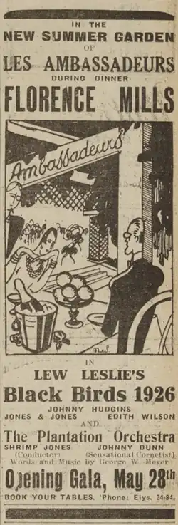 The new formula lasted until 1929, and was a real success, mainly due to the arrival in France of excellent American and African American artists, singers, dancers and jazz orchestras, to attract the growing number of American tourists.[9][14][15] (Each summer from 1926 to 1929, well over a quarter of a million Americans came to Paris.[16]) Following the success of Josephine Baker in the Revue Nègre in 1925, in May 1926 Les Ambassadeurs imported Lew Leslie's Blackbirds featuring Florence Mills, Edith Wilson, Johnny Hudgins and the Three Eddies with the Plantation Orchestra (led by violinist Ralph "Shrimp" Jones).[17][12][13][18]